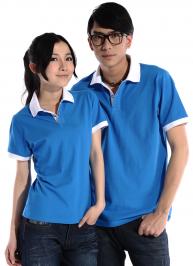 天藍(lán)色珠地棉T恤衫,領(lǐng)袖黃色間條撞色,男女款式訂做
