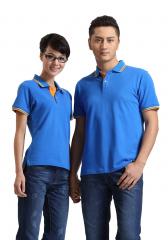 天藍色珠地棉T恤衫,領袖黃色間條撞色,男女款式訂做